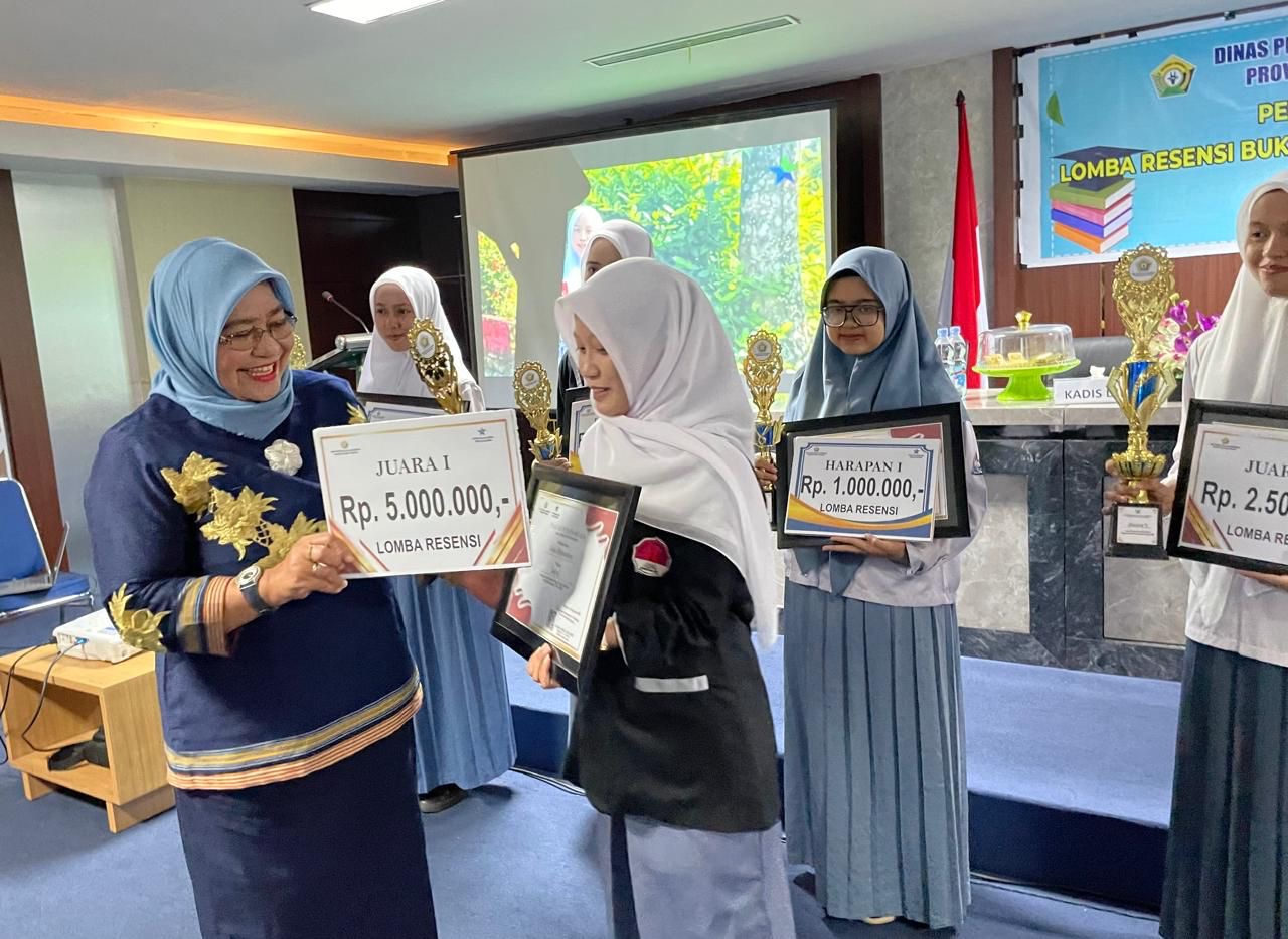 Kadis Perpustakaan dan Kearsipan Provinsi Sultra, Hj.Usnia menyerahkan penghargaan kepada pemenang lomba resensi buku tingkat Provinsi Sultra.
