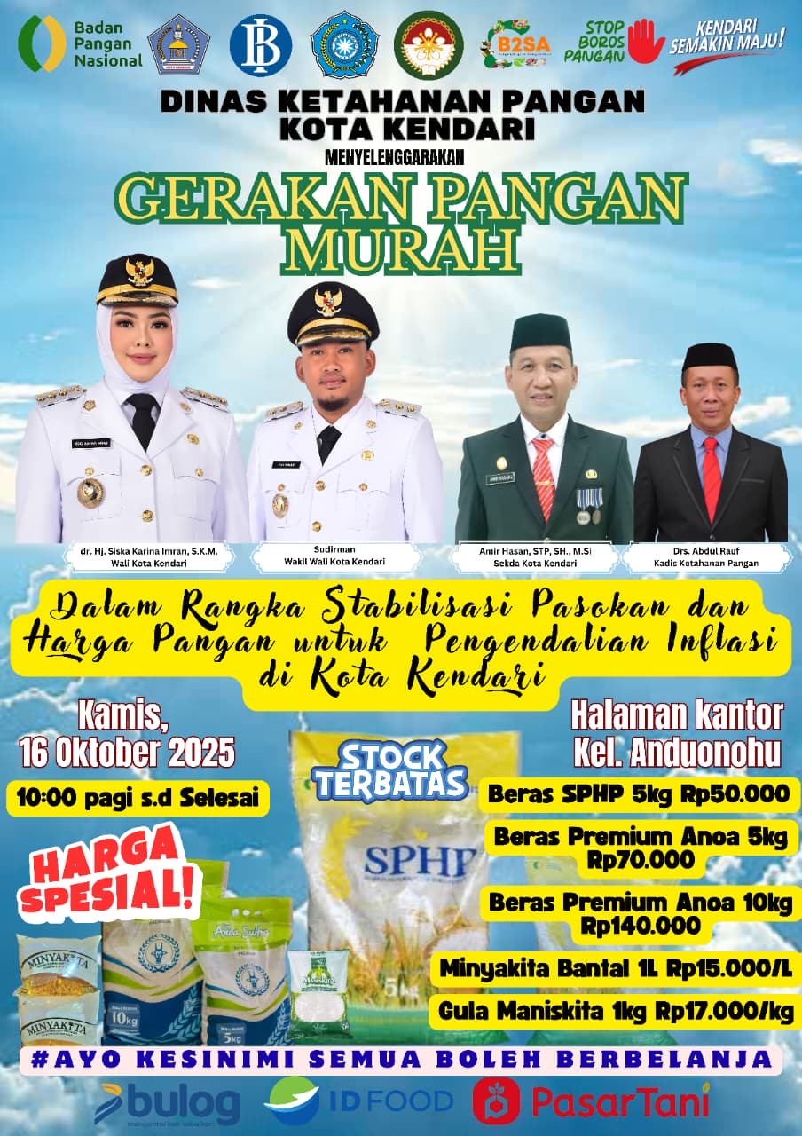 Kunjungan ini secara khusus akan meninjau langsung pelaksanaan Gerakan Pangan Murah (GPM) yang akan digelar di Kantor Kelurahan Anduonohu, Kecamatan Poasia, pada Kamis (16/10/2025).