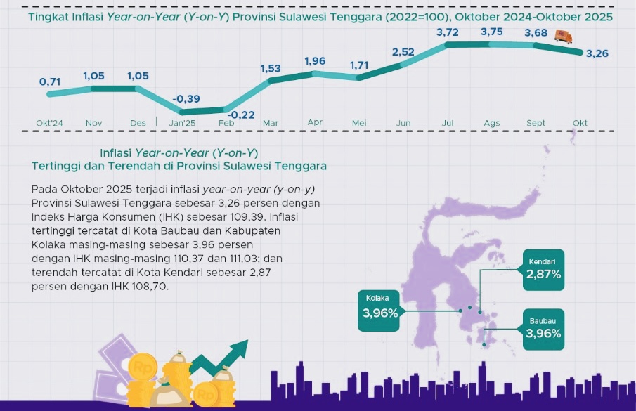 Kendari, Sulawesi Tenggara — Badan Pusat Statistik (BPS) Provinsi Sulawesi Tenggara (Sultra) mencatat terjadinya inflasi year on year (y-on-y) sebesar 3,26 persen pada bulan Oktober 2025.