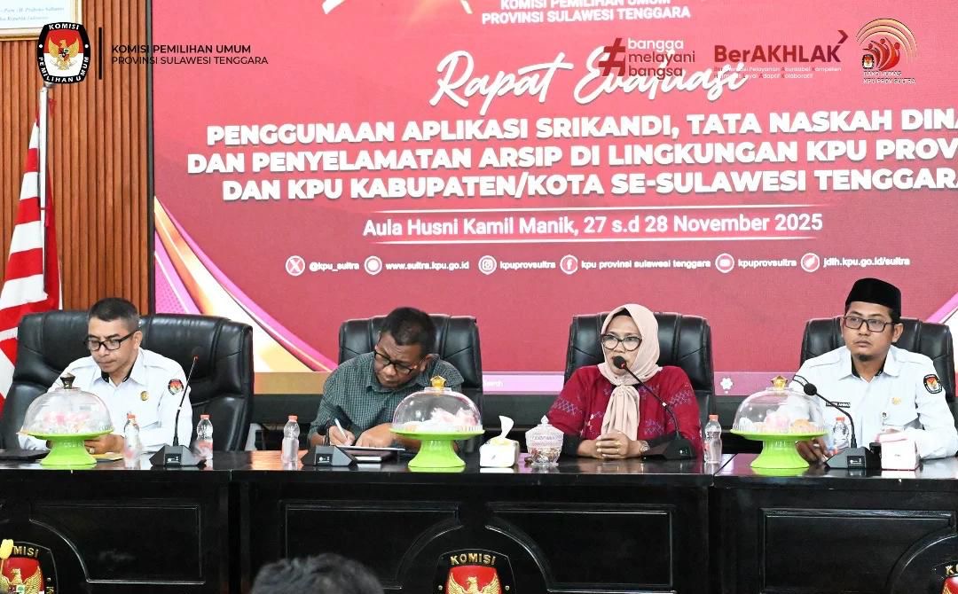 Kendari – Komisi Pemilihan Umum (KPU) Provinsi Sulawesi Tenggara (Sultra) menggelar Rapat Evaluasi intensif terkait implementasi Aplikasi Sistem Informasi Kearsipan Dinamis Terintegrasi (SRIKANDI), Tata Naskah Dinas, dan Penyelamatan Arsip, Kamis (27/11/2025).