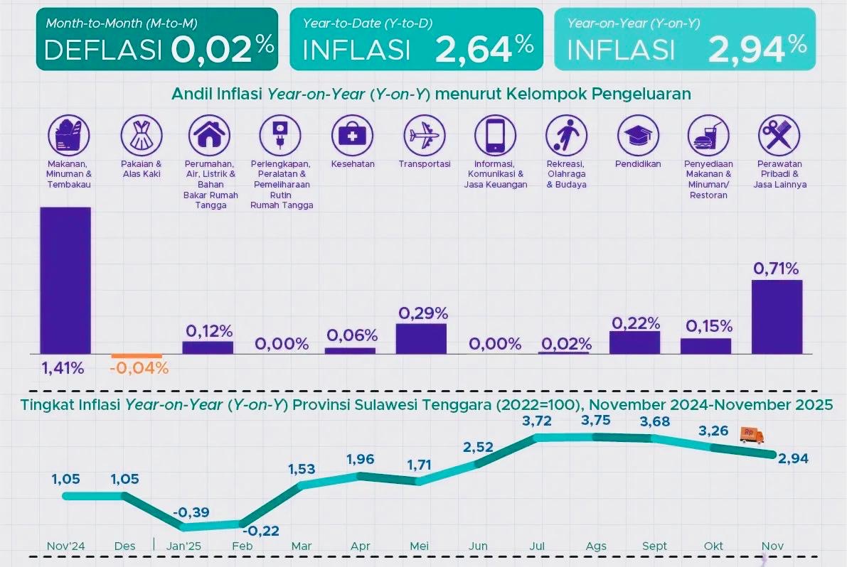 Per November 2025, Sulawesi Tenggara tercatat mengalami inflasi 2,94 persen.