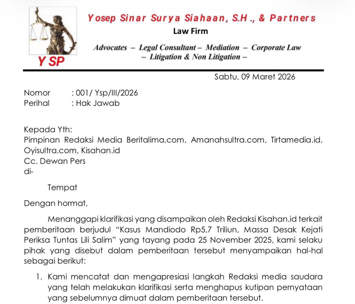 Tim hukum juga meminta agar media terkait memuat hak jawab tersebut secara proporsional dan memastikan klarifikasi yang telah diterbitkan dapat diakses secara terbuka oleh publik.